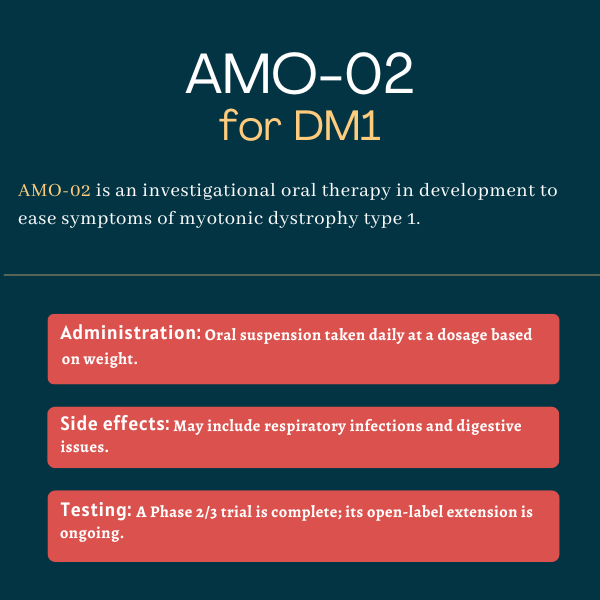 AMO-02 is available as an oral suspension. In a Phase 2/3 clinical trial in congenital DM1, the therapy was administered daily at weight-adjusted doses ranging from 400 to 1,000 mg per day.