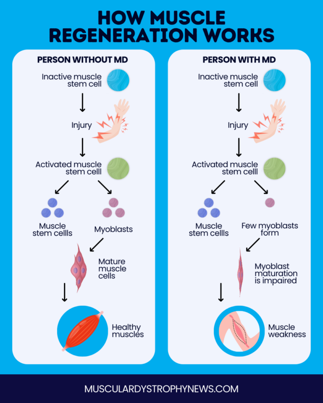 Ultimately, abnormal and overworked muscle stem cells are not as effective at repairing and regenerating muscles, which can contribute to the muscle weakness and mobility problems seen in MD. Some of these processes are also at play in other, less common types of MD.