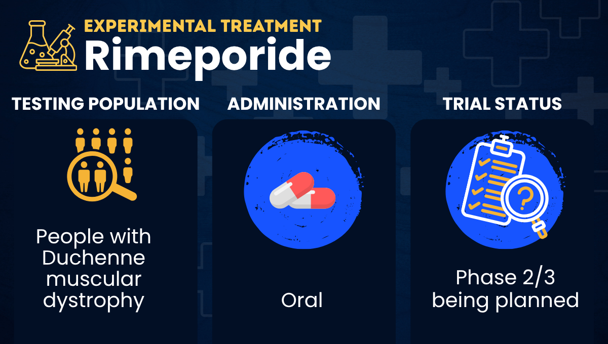 Rimeporide, formerly known as EMD-87580, is an experimental oral therapy designed to preserve heart function and limit muscle damage in people with Duchenne muscular dystrophy (DMD).